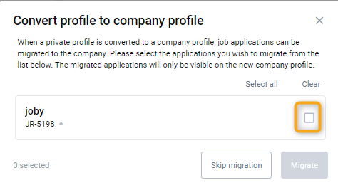 Mark the Job Request applications that should be migrated to the Company you have requested to join.