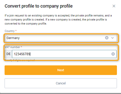 - Select the country of registration for the Company you are converting to or to join. Enter the VAT number