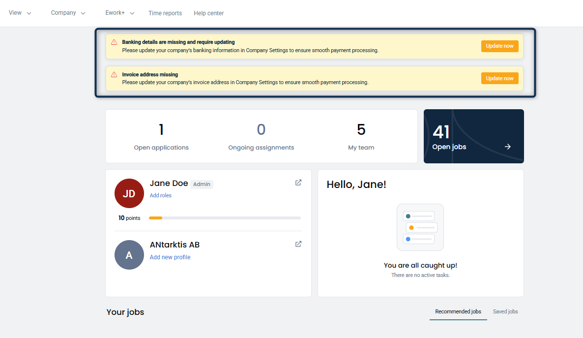 When you as an admin access your account, you will receive notifications if your banking details or invoice address are missing or incomplete. These notifications will prompt you to update your information, which is essential for maintaining accurate records and ensuring timely payments.